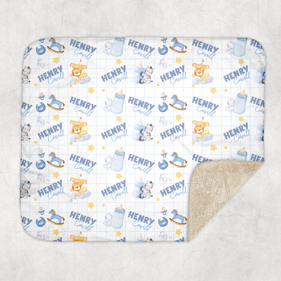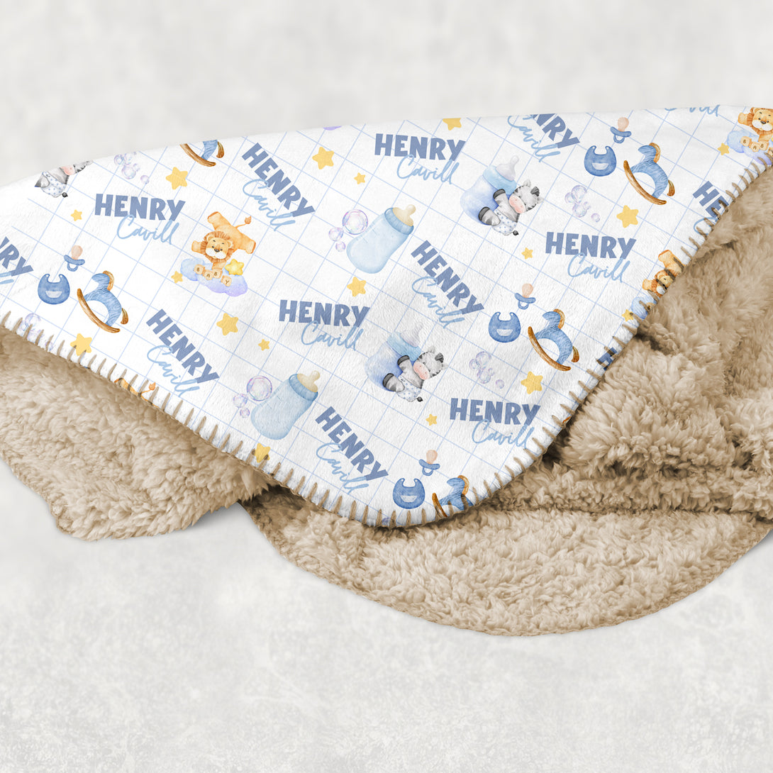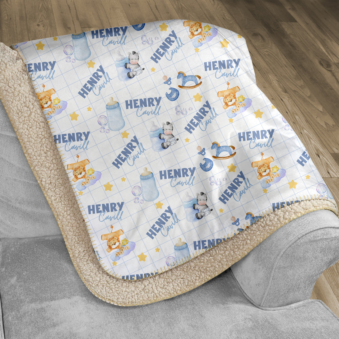 - Material: Minky style fleece with sherpa lining. Whip stitch edging, super-soft sherpa lining