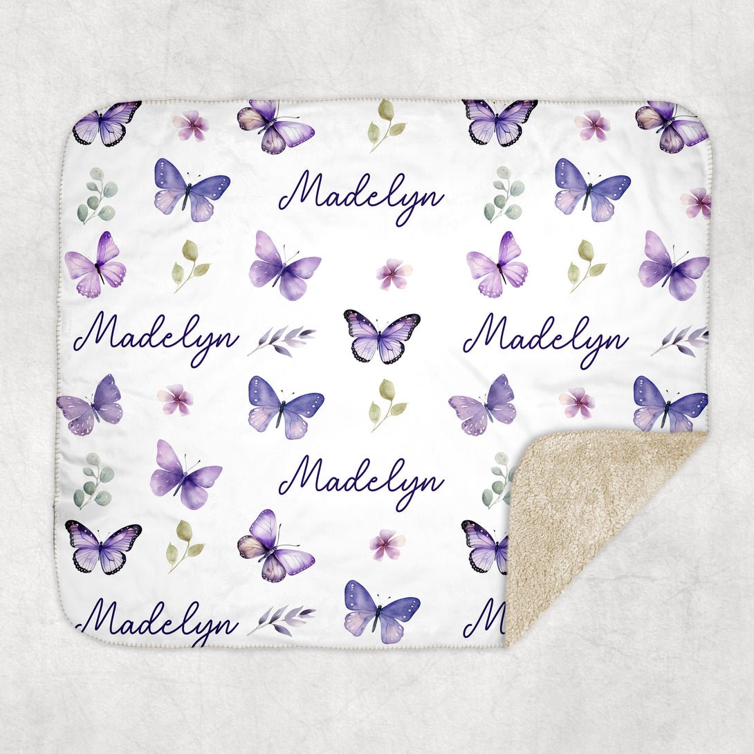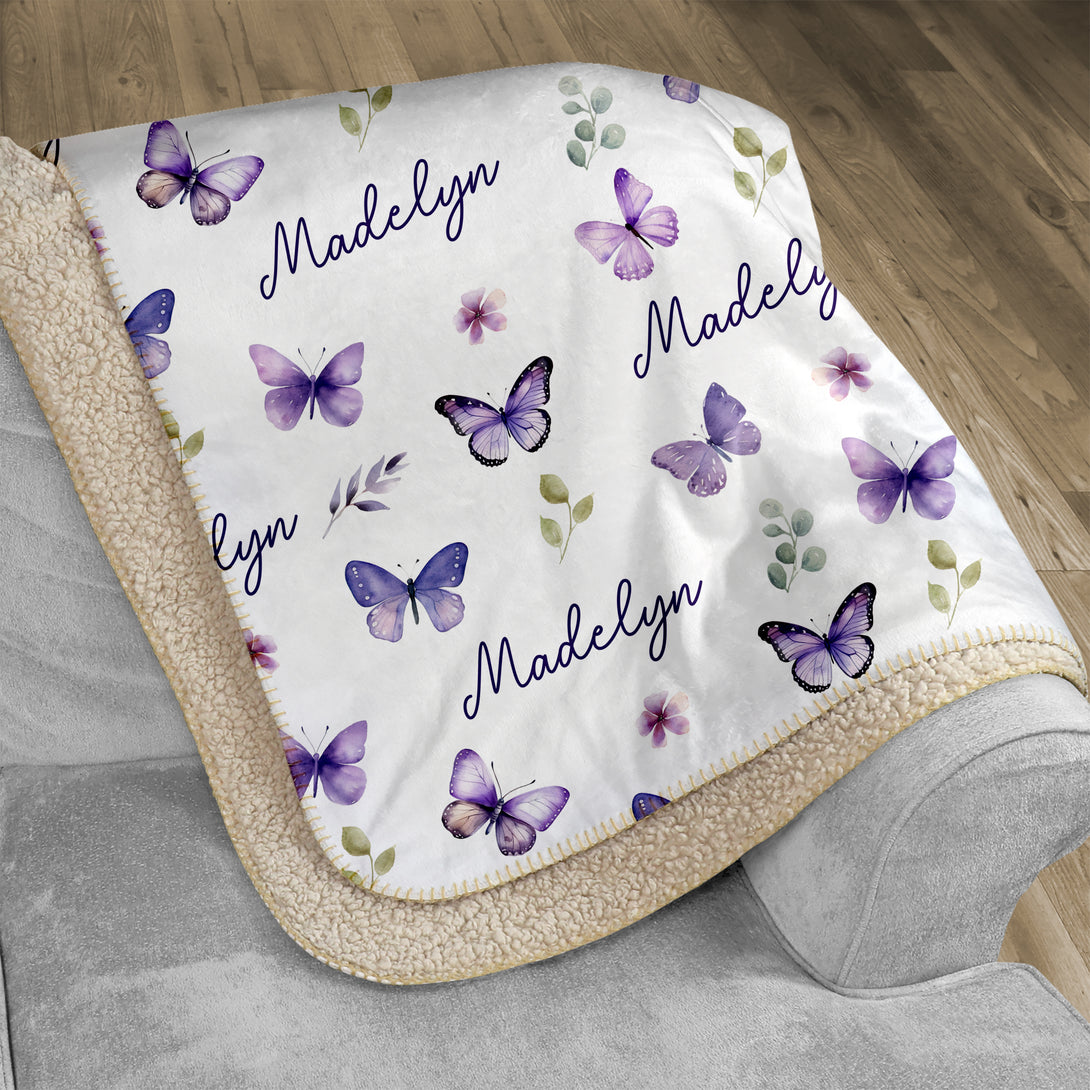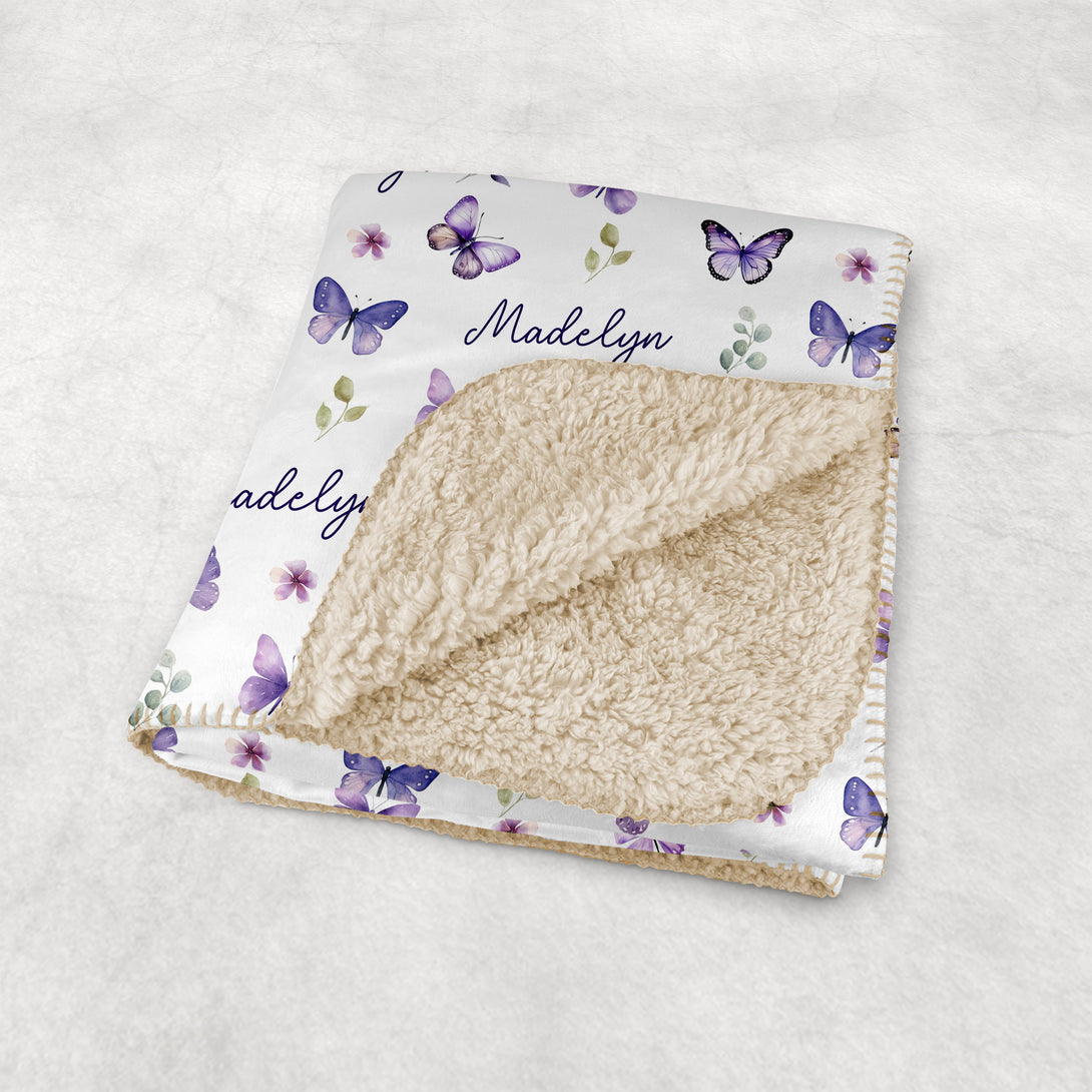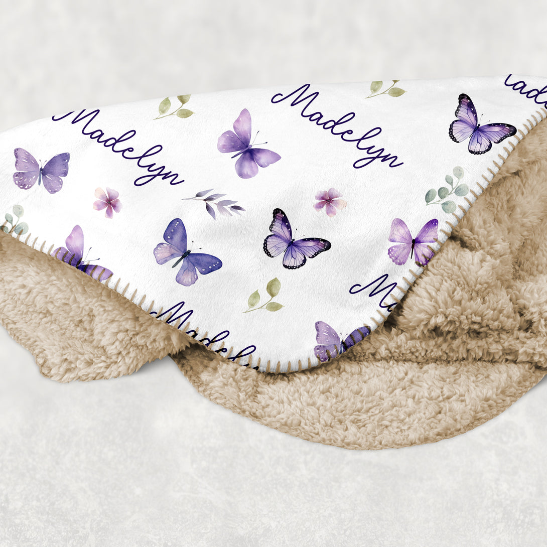 - Material: Minky style fleece with sherpa lining. Whip stitch edging, super-soft sherpa lining